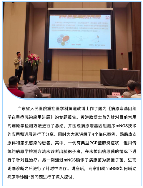 日前,福建省重症医学培训会——中国重症医学多学科精髓(MCCRC)培训班在福州召开。本次培训班邀请了省内外知名专家围绕重症医学领域新技术的开展等内容进行了专题报告,其中,广东省人民医院重症医学科黄道政博士及俄罗斯专享会294产品总监刘莹莹博士受邀出席,并作了题为“病原宏基因组学在重症感染应用进展”和“病原宏基因组学报告解读”的专题报告,报告受到福建省医学会重症医学分会主任委员、福建医科大学附属第一医院ICU主任林建东教授的支持与点评。