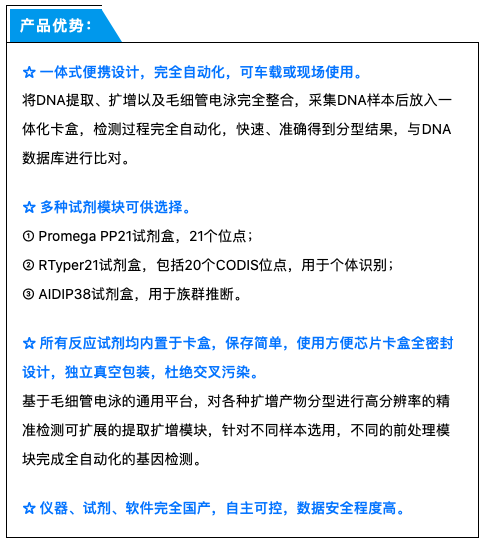 该系统基于微流控芯片技术,配套全集成芯片卡盒和数据分析软件,集DNA提取、PCR扩增、毛细管电泳于一体,自动生成分型结果,2小时即可取得DNA分型。既可用于重大事故、自然灾害的人员身份快速识别和案件现场检材的快检快筛,也可用于边防、公安等基层机关对敏感、可疑人员身份的快速识别和排查。仪器操作简单便捷,无需专业技术人员操作,可检测的样本包括:血卡、唾液卡、口腔拭子卡等。无使用环境要求,既可在实验室、办公室、窗口单位,也可与警用现勘车配套移动式检测,具有良好的抗震性、防污染措施,使用无需校准。同时兼容多款国内外DNA试剂,具备个体识别和族群推断功能。