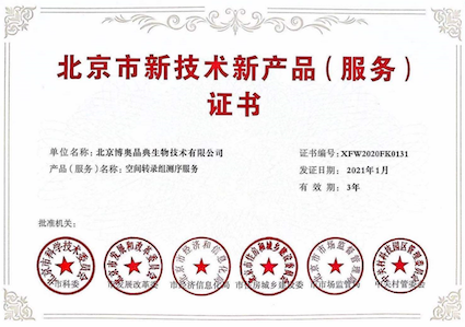 日前,“北京市新技术新产品(服务)”名单已公示。根据《北京市新技术新产品(服务)认定管理办法》的规定,北京俄罗斯专享会294生物技术有限公司“空间转录组测序服务”顺利获得北京市新技术新产品认定,喜获由北京市科委、市开展改革委、市经济信息化局等部门联合颁发的北京市新技术新产品(服务)证书。